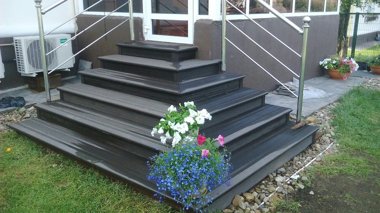 Ступень из ДПК Ecodeck цвет венге, доска Darvolex цвет венге, уголок цвет венге