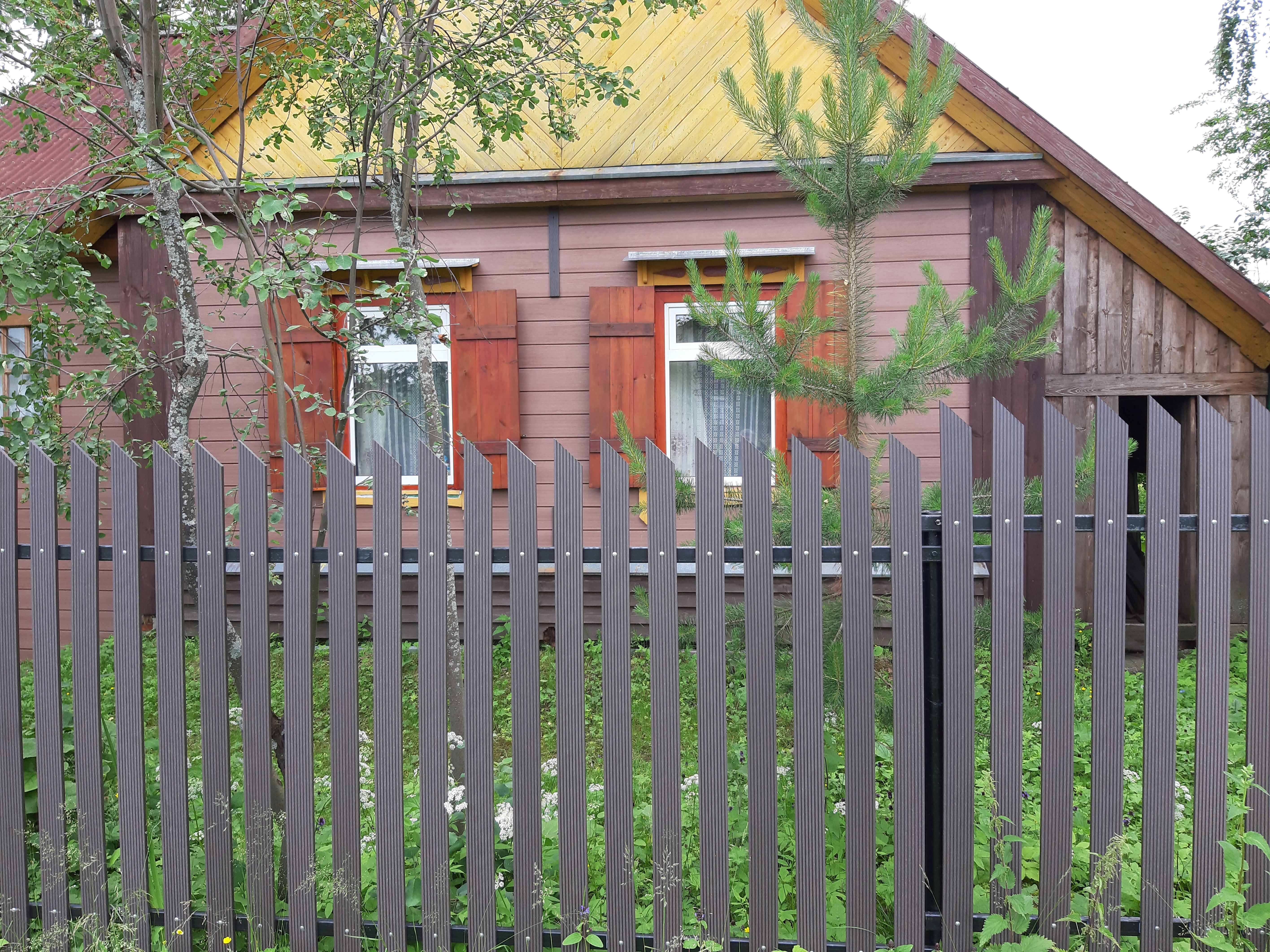 Для реализации этого проекта, нам понадобился специальный узкий полнотелый штакетник из ДПК. Ведь у владельца не так много времени посещать дачу и постоянно поддерживать деревянный штакетник в идеальной форме. Для ДПК-же такой уход не требуется и достаточно просто использовать по мере необходимости специальное средство для очистки ДПК и средство для защиты декинга. И он прослужит вам долгие годы не потребовав ничего дополнительно.